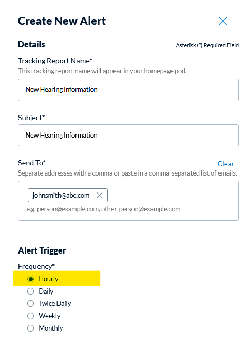 Fill out the Create New Alert information form, which includes more frequency options, and select save: