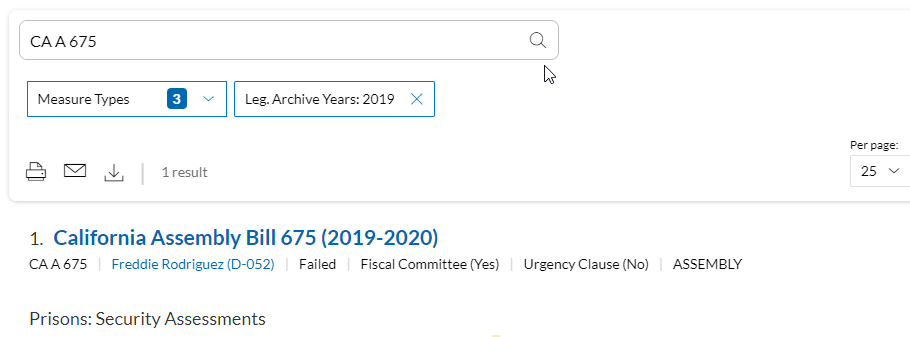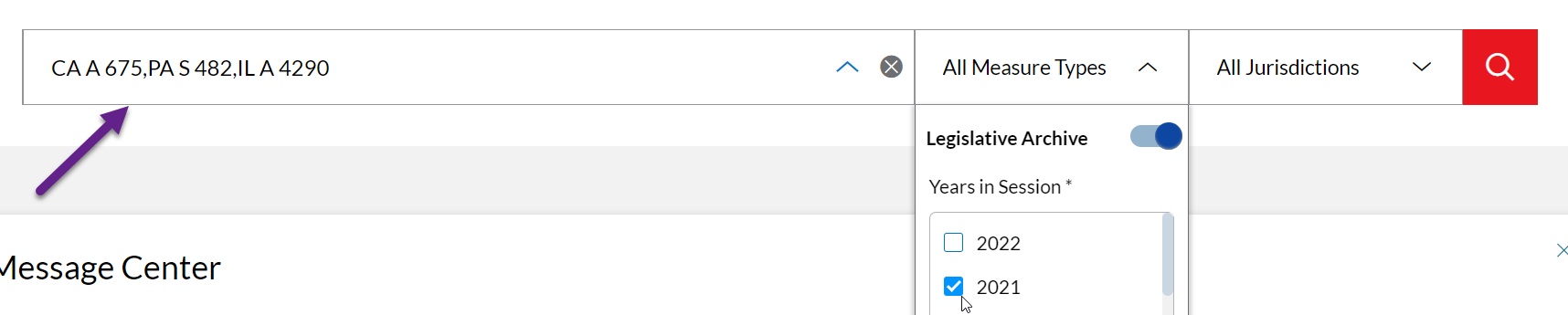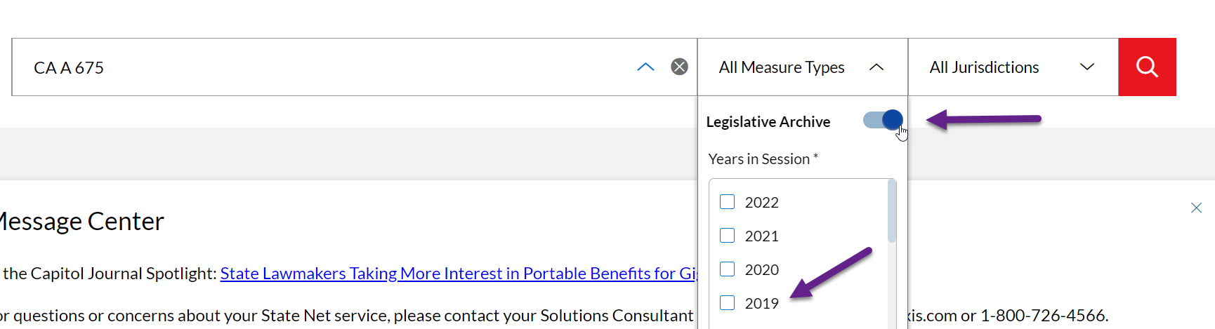 To search for a bill that's been archived in State Net, enter the bill number (or a string of bill numbers separate with a comma) in the search bar. Then, select the All Measure Types drop down menu, toggle on Legislative Archive, and select the bill's year of introduction.