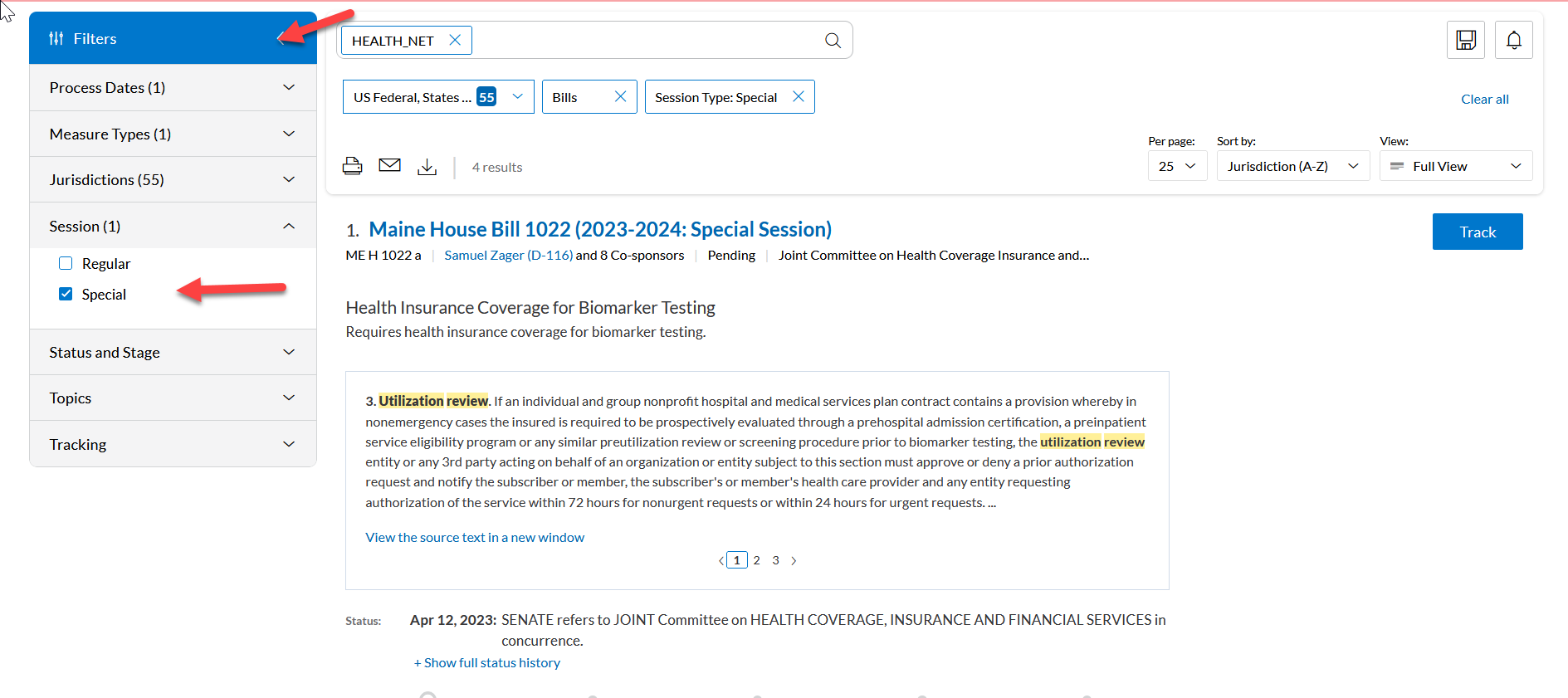 You can find special session bills by using the Session Filter located on the left hand side of your screen after your search results have loaded.