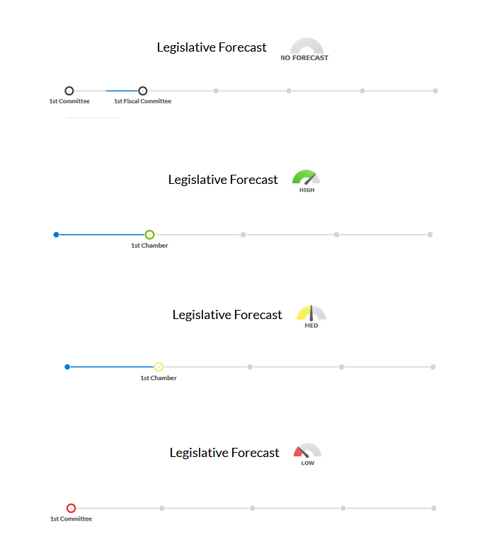 Legislative Outlook is provided for all bills but the probability scores are not applicable for enacted, vetoed, or failed legislation so the scores are hidden at those stages. Additionally, a “No Forecast” score is displayed for resolutions, ballot measures, and executive orders.