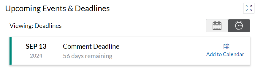 Upcoming Events: including Hearings and Comment deadlines that you can download into your calendar |