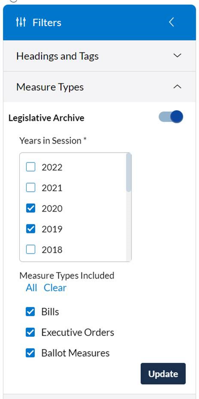 Click on the toggle and search across legislative measures from previous session years.