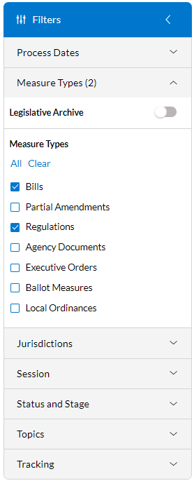 Allows you to refine your search results down to the legislative status of a bill as reported by the state.